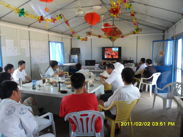 “金虎辭舊歲,玉兔迎新春”。2月2日,在祖國舉國歡慶,萬家團聚的時候,項目經理候學剛首先致辭。隨后,公司副總經理黃鄭民轉達了公司董事長、總經理王元旦同志向戰斗在國外的同志們的親切問候和良好祝愿,并總結了一年來項目部取得的可喜成績,對2011年寄于主體工程基本完工的希望,相信灌溉項目一定會是安全的、高效的。