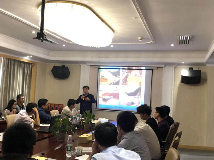 現場參觀結束后,學習團參加了技術培訓和經驗交流會。總經理助理杜凌主持了開班儀式。總工程師胡鴻煌、項目副經理李成,對洋前壩水庫的大壩總布置、大壩施工導流、大壩及供水管道施工技術細節等,通過文字、圖片、視頻等組成的PPT課件為學員授課,并就學員提出的問題逐一進行了解答。