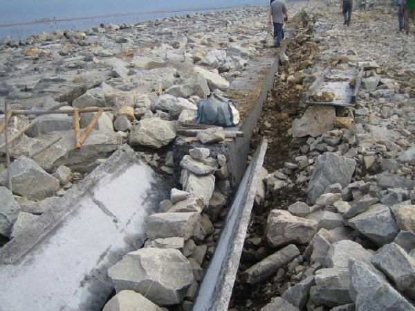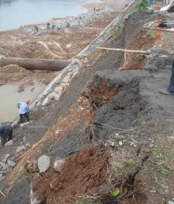 ③迎水側護坡基座不宜過低,避免基礎松軟引起沉降。開挖前應作必要的探查,也可避免機械陷落。