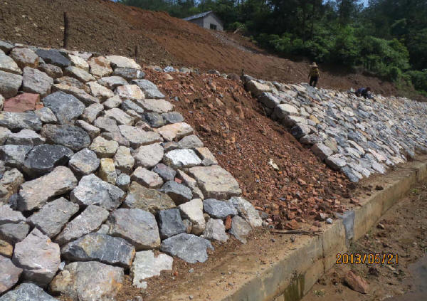 擋墻砌筑應分層,每一砌筑層擺石時均應座漿,隨鋪漿隨砌筑。嚴禁石塊大面無漿直接貼靠。混凝土必須用振搗器逐縫振搗。當豎縫寬度在5cm以上時,可填漿后塞片石。嚴禁先堆砌石塊再用膠結料灌縫。