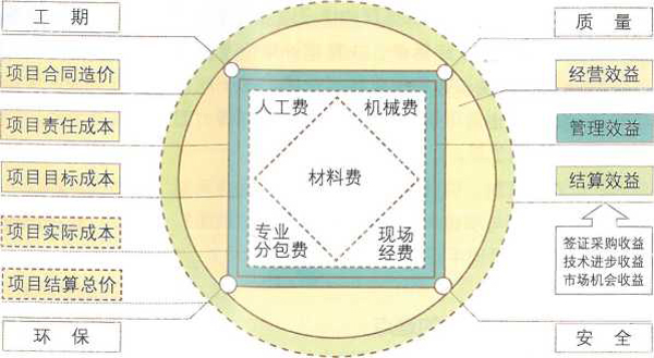 “方圓圖”是具有操作性的工具。其一,“方圓圖” 完整詮釋了建筑項目管理行為間的關(guān)系。“接項目”確定了合同造價,對應(yīng)方圓圖的實線圓;“做項目”的第一步是下達(dá)項目目標(biāo)責(zé)任書,確定項目責(zé)任成本,對應(yīng)方圓圖的責(zé)任成本方形,第二步分子公司在責(zé)任書的基礎(chǔ)上進(jìn)行項目實施策劃,產(chǎn)生項目的目標(biāo)成本,對應(yīng)方圓圖的目標(biāo)成本方形,第三步就是項目實施過程的管控,最終確定實際成本,對應(yīng)方圓圖的實際成本方形。“算賬收錢”就是完成項目過程中的結(jié)算變更與最后的決算收款,從而確定結(jié)算造價,對應(yīng)方圓圖的結(jié)夢造價虛線圓。項目實施過程中進(jìn)度、質(zhì)量、安全、環(huán)保及周邊相關(guān) 方的管理對應(yīng)成本方形的四個支撐頂點,構(gòu)成成本的五項費用“材料、人工、機械、現(xiàn)場經(jīng)費、專業(yè)分包”對應(yīng)成本方形的內(nèi)部區(qū)域。