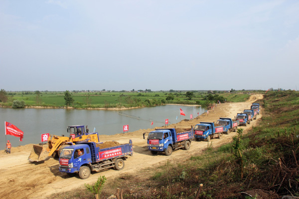 受前期連續(xù)強(qiáng)降雨及長(zhǎng)江洪水倒灌、頂托影響,九江市河湖水位長(zhǎng)時(shí)間處于超警戒水位狀態(tài),導(dǎo)致該地區(qū)防汛形勢(shì)十分嚴(yán)峻,圩堤險(xiǎn)情隨時(shí)可能發(fā)生,特別是堤腳處有池塘的圩堤更易出現(xiàn)險(xiǎn)情。為確保廬山市沙湖山圩堤長(zhǎng)期穩(wěn)固,我司在接到該市防汛指揮部的除險(xiǎn)加固任務(wù)后,立即派遣抗洪搶險(xiǎn)突擊隊(duì)前往現(xiàn)場(chǎng)進(jìn)行搶險(xiǎn),以穩(wěn)固圩堤,確保圩堤內(nèi)村莊百姓及農(nóng)田安全。經(jīng)過(guò)現(xiàn)場(chǎng)勘查,突擊隊(duì)決定沿著圩堤腳有池塘的地段填出一條長(zhǎng)約1公里、寬20米的壓浸平臺(tái)進(jìn)行加固處理。搶險(xiǎn)方案確定后,公司迅速組織了3臺(tái)挖掘機(jī)、2臺(tái)裝載機(jī)、36臺(tái)自卸汽車等機(jī)械設(shè)備及40多名作業(yè)人員頂著炎炎烈日進(jìn)行施工,力求在10天內(nèi)完成搶險(xiǎn)任務(wù),確保圩堤安全。